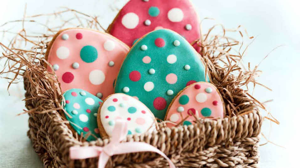 4. Roll out half of the dough on a lightly floured surface to 5mm thick. Bend an 8cm cutter into an egg shape. Cut out 8 biscuits, rerolling the scraps if needed. Arrange the biscuits on one of the trays and repeat with the other half of the dough.