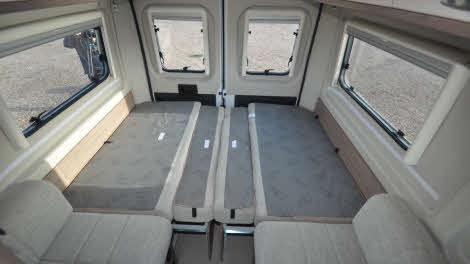 Either of the settee bases can be used to stow your bedding. You can access these via large doors or by hingeing up the slatted sections. In addition, there’s a small hatch at the end of the nearside settee which is accessed when the rear doors are open – it’s ideal for stowing items such as your mains lead.