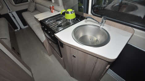 Compass has struck the right blend of cooking facilities and storage space in the kitchen. Thetford’s Triplex cooker has a three-ring gas hob and a combined oven and grill, complemented by a deep, circular sink with loose cover that will need to be stowed for travel. A worktop extension to the left of the hob is a useful addition.