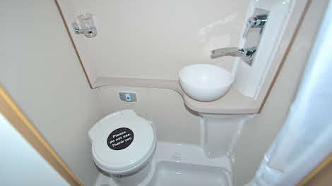 There are plenty of pluses in this department. The overhead lockers have positive locks and there are switched LED reading lamps as well as ambient strips over the lockers. The storage space over the cab is handy while smoke and carbon monoxide alarms are set in the ceiling. The only minus I could find was that the back of the kitchen’s overhead locker flexes too much.