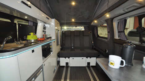 There’s lots of LED lighting, including downlighters along both sides of the main living area, two reading lamps, ambient strips at floor level, plus a trio of bullet lights to the underside of the roof bed. There are bullet lights over each swivelled cab seat and one downlighter in the upper bed area. Van-X blackout curtains – a neat solution in a campervan – take up very little space.