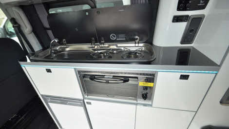 There’s the de rigueur two-ring gas hob and sink combination here under smoked glass lids, along with a Dometic compressor fridge,