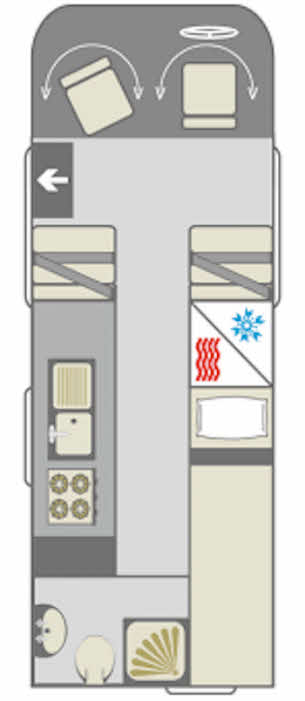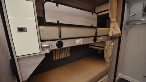 Both featuring metal frames with wooden slats, those bunks are an impressive 6ft 8in long. The upper one is hinged so it can be locked in a nearly-upright position to make the whole rear area seem much roomier in daytime mode.
