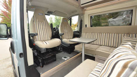 With two tables and no fewer than three table ‘slots’ you’re spoilt for choice in normal daytime mode. Do note the cab and rear seats are at different heights, though, and with the former fully swivelled your legs are likely to dangle (despite the fact they are adjustable). As an alternative, you can make an inward-facing settee, with a commendably high backrest, along the offside.