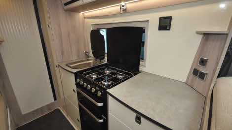 Few van conversions can offer as large a kitchen area as this. It’s still fairly uncommon to provide a full cooker like the Thetford Caprice with four gas rings, separate oven and grill plus a floor-level pan store, as here – let alone place it in the very centre of the worktop. You will need to close the lid to add the drainer when you’re washing up, but there’s a helpful section of permanent worktop to the right of the cooker.
