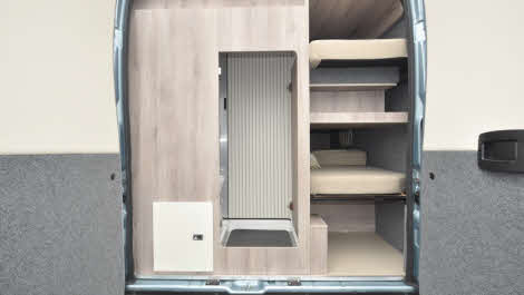 A well fitted-out, extra-long van conversion that really can cater for families of four. As well as bunk beds, you get a great kitchen and a decent washroom.