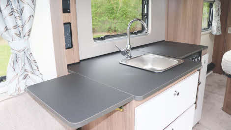The worktop-matching hob cover does a good job of smartening up a facility that is already rather dashing (the plastic Unicorn-branded splashguard notwithstanding), as well as potentially providing more useful work surface. But if the hob is in use (as it’s bound to be much of the time), it’s obviously out of bounds. Fear not, though – there’s a little fold-up extension that can be brought into play.