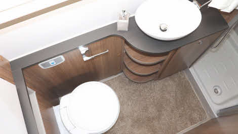 However, buyers choose the Vigo because, first and foremost, they want a classy en-suite bedroom – and that’s exactly what they get. The plush 6ft 1in-long transverse island double pushes back during the day to provide more walking/dressing space around the base, although there’s still enough room to shuffle past when it’s fully extended. The individual padded headrests look good, and the reading lights both include USB sockets (as do two of the four readers in the lounge). Each occupant gets a little bedside shelf that’s perfectly big enough to accommodate a glass of water and reading glasses, and they each receive their own wardrobe too. A wide-opening sunroof lets daylight in while you enjoy that first cuppa in bed. Even in day mode, the bed makes a welcome retreat if you want to put your feet up and read for a bit on a rainy afternoon. The bedroom closes off by means of a concertina fabric blind; effective at what it does, but lacking the finesse of a ‘proper’ door.