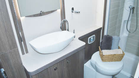 The compromises found in the bedroom on the other side of the wall at the back are nowhere to be seen in this super-smart, super-spacious facility. The tile-effect finish in the shower cubicle looks great, as does the back-lighting on the usefully long mirror. Add in a swanky hand basin and the heated towel rail/radiator and you have a set of features that make this the most stylish caravan washroom I’ve seen for a while. The retractable hanging rail in the shower is a useful touch, and there’s very good storage provision. Outstanding.