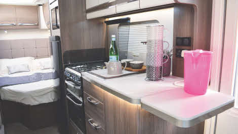There’s plenty of storage and it’s all easy to get to – there are exterior-access hatches for the lockers under the double bed and the nearside front seat locker. Drawers and cupboards are bountiful; the shelves in the latter can be removed to provide extra height.