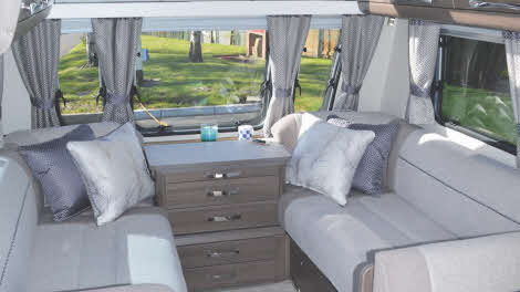 Living space is what this new caravan is all about. As soon as you step in through the entrance door, that width really makes its presence felt: four people can settle back into the sumptuous seating with room to spare. The upholstery looks elegant and restrained, and there are practical benefits, too – a virtually imperceptible outer membrane means that stains can simply be wiped away with a damp cloth.