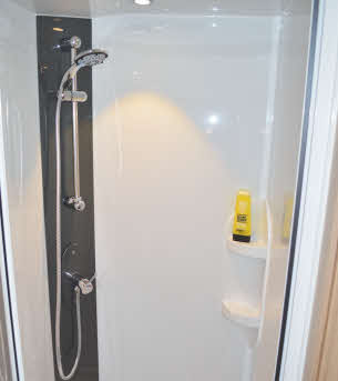 There’s almost an embarrassment of storage, with overhead and floor-level cupboards and usable open shelving. The wardrobe is in here too – it comes with a neat laundry bag and drawers underneath. The shower is a beauty – spacious, nicely lit and with plenty of places to put your gel and shampoo.