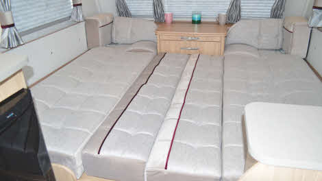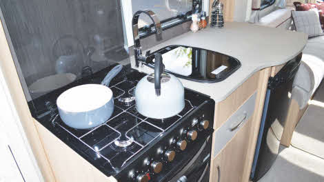 When you’ve finished making up the front double bed, you have a vast mattress more than six and a half feet long and nearly five feet wide to fall into – and it’s superbly comfortable. Prefer singles? Then you get a pair, both 6ft 1in long. Even the side dinette seats transform into a six-foot bed if you have an overnight guest (just be aware that there’s no privacy curtain here, though). A pull-out overhead bunk is a £295 option.