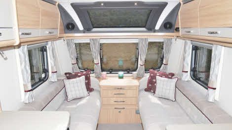 There’s masses of storage in all areas of the caravan; and although the front seat lockers don’t have wide-opening hatches, the bases do lift supremely easily and self-support on hydraulic struts. The loose-fit carpeting is divided into easily-manageable sections, and it feels nice and plush underfoot.