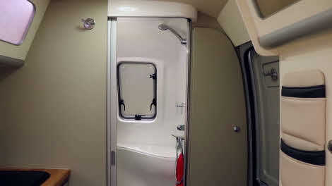 While the washroom, like the kitchen, is eye-catching to look at, it’s a bit of a squash in here, mainly as it is situated almost at one extreme of the egg-shaped body. The floor of the shower is recessed to eke out a bit more headroom and you can lift out the wooden duckboard to claim a few more millimetres. The shower head detaches to double up as the wash-basin tap.
