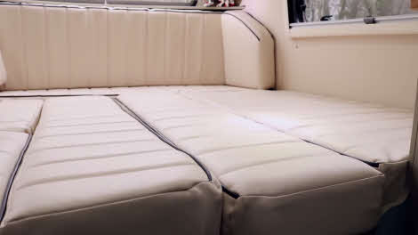 The compromises of the daytime arrangement melt away as soon as you lay your head on the 6ft x 6ft double bed (note: now listed as 5ft 9in x 6ft 1in on Go Barefoot website) into which the lounge seating quickly transforms into. All the upholstery sections are flat, which means a completely level mattress that offers fine comfort and support. It’s easy to make up: first retrieve the extra section of bed base and fitted mattress section from under the ‘seating’ section along the front. Then slide out the two bits of bed frame from under either sofa, put the extra little piece in place and rearrange the upholstery accordingly.