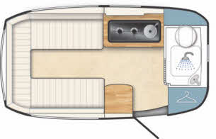 The separate gas locker on the front may look compact, but it more than earns its keep: as well as two gas bottles, the spare wheel has a home in here. Storage space inside the caravan has been well thought out, with a couple of big cupboards, underseat lockers (one of which hosts a fresh water tank, complementing the usual external inlet) and attractive, semi- enclosed, overhead shelving providing adequate space for two people’s goods and chattels. The wardrobe is necessarily bijou, though, so don’t expect much in the way of hanging space.