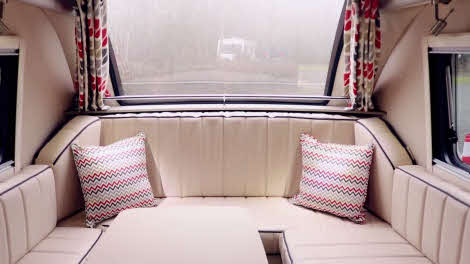That’s not the only decision you have to make. The bodyshell of our test caravan is grey – cream, duck-egg blue and dusty pink are the other options. You then choose from seven finishes to the kitchen and washroom units, and from a range of patterns for the curtains – you can even provide your own fabric and Go Barefoot will make them for you. Oh, you also get to choose the colour of the cute Roberts Revival DAB radio that’s included in the package.
