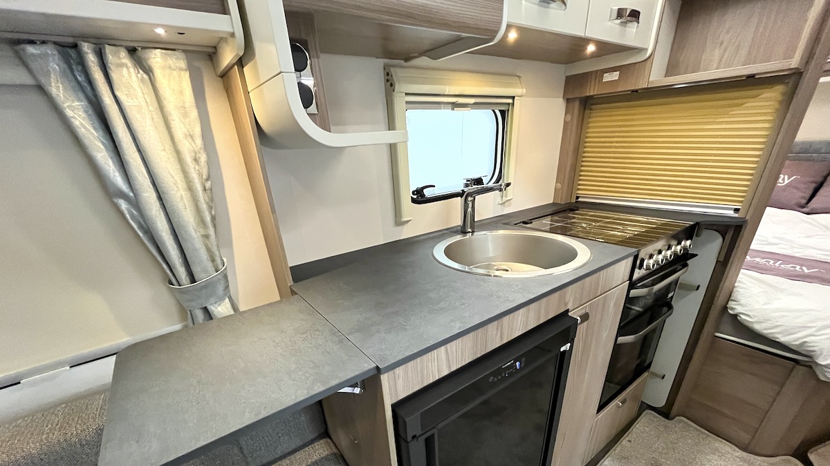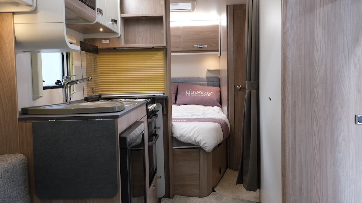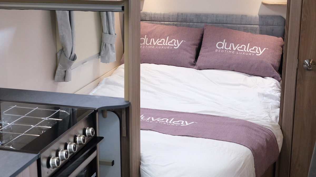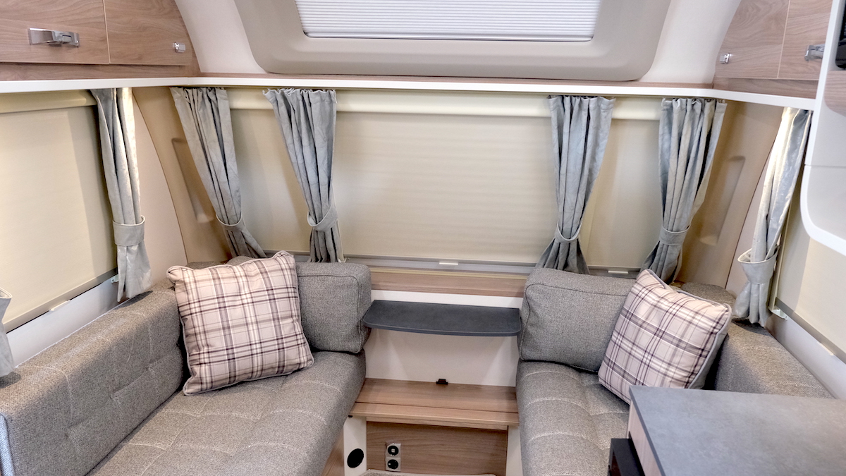 The 6ft 2in-long bed has a good-quality Duvalay mattress that gives lots of comfort and support. Little over-the-shoulder shelves will accommodate your overnight glass of water or morning cuppa. Just one negative back here: the curtain that shuts off the bedroom from the rest of the caravan was ill-fitting in this example, and not very inspiring in terms of colour.