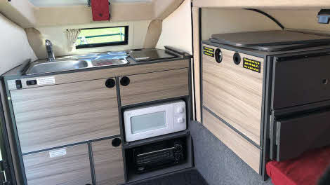 Er, no. A floor-level cupboard in the kitchen area discreetly conceals a portable loo – and there is space for it to be used with the bed made up, even if the most likely (and most dignified!) overnight home for it would be in the awning.