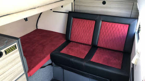 Even with the Podrant deployed and the roof raised, there’s only so much living space you can magic up in something as small as this – not everyone could get by with the slightly enclosed ambience of the interior, not helped by having just one little window to look out of when seated. That said, the attractive leather/suede double seat is plush and comfortable, and even with the neat, slide-on tables in place at mealtimes, there’s still enough room for someone to wander (okay, step) over to the fridge to fetch another beer.
