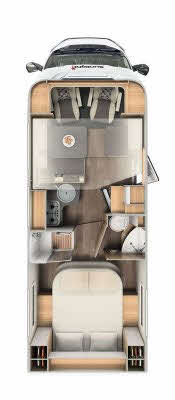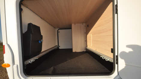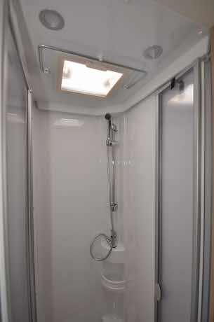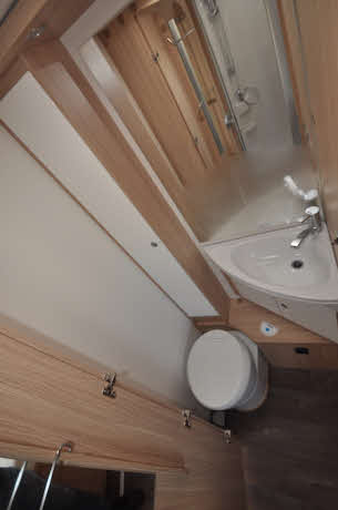 Conventionally, an end bedroom usually necessitates the splitting of the toilet and shower facilities, and here you get a toilet room on the offside and shower cubicle on the nearside. The cubicle has double door access and a duckboard on which to stand while you’re drying. It’s fully plastic-lined and there’s a hanging rail for wet things. There’s a rooflight and two LEDs, while the showerhead is on a riser bar.