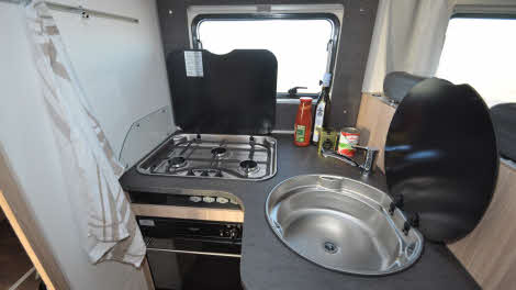 Kitchen storage is good, with a cutlery drawer, floor-level drawer under the oven, single large overhead locker (shelved and divided) and a shelved locker that also incorporates a waste bin.