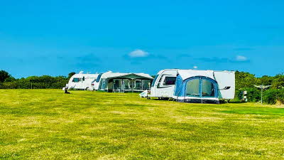 Our campsite is very spacious and level, each pitch has its own electric, water supply and Wi-Fi. Horses peacefully graze over the fence from the campsite and past an ancient standing stone the sea can be seen.