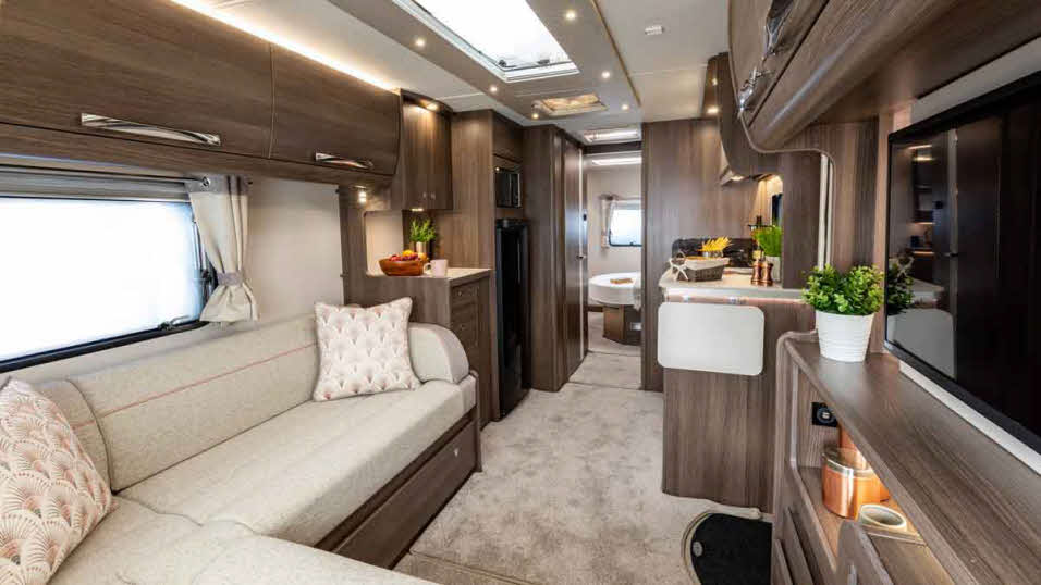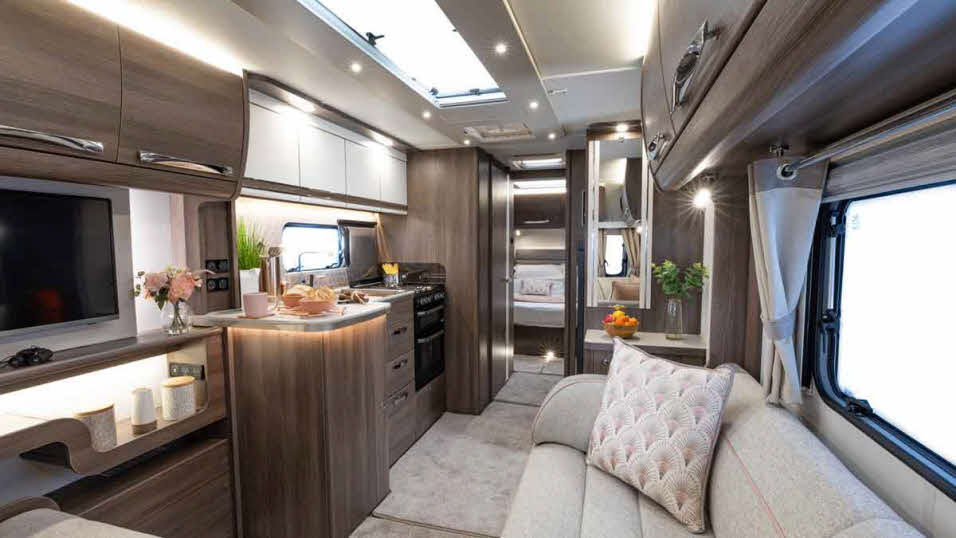 - Layout: central kitchen / rear washroom / fixed French transverse bed
