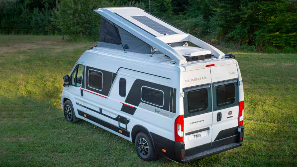 - Layout: central kitchen / central washroom / fixed rear single beds / front drop down bed