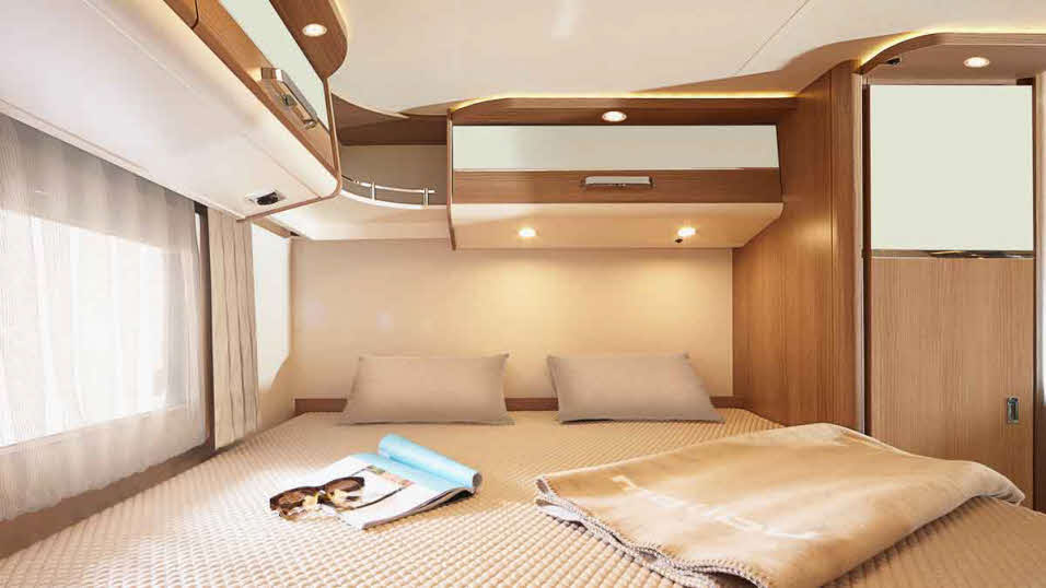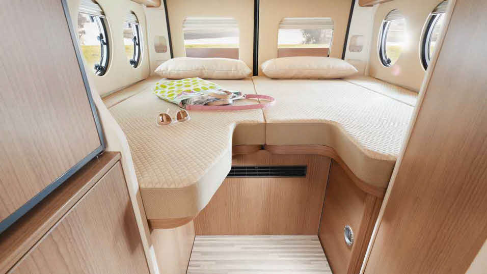 - Layout: central kitchen / central washroom / fixed rear single beds