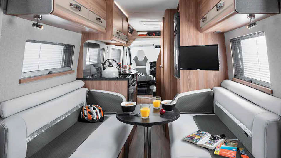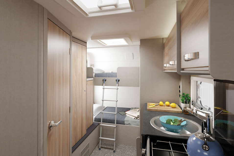- Layout: central kitchen / central washroom / fixed rear single beds